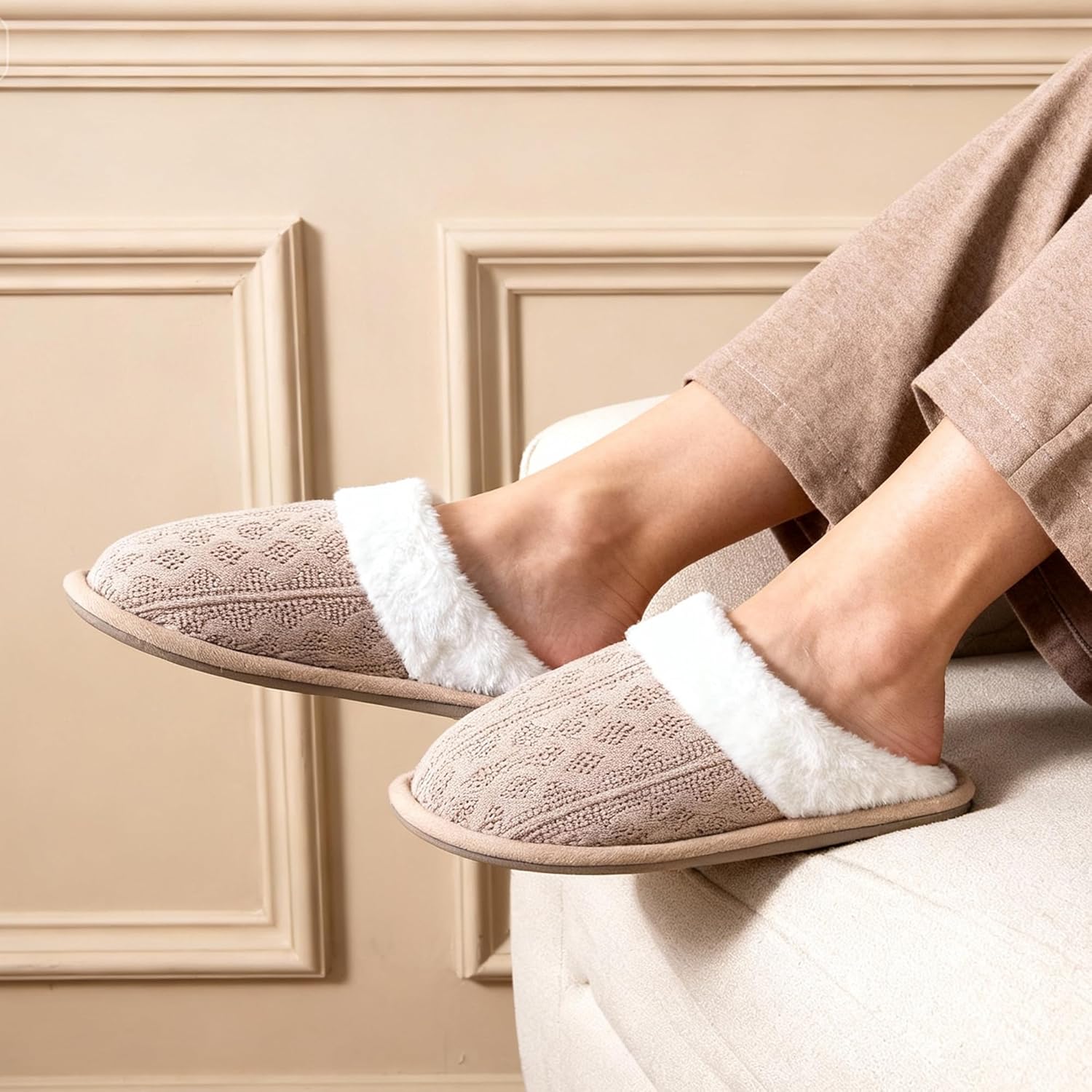 • 【Knit upper for easy slip-on and slip-off】 Made with a flexible knit upper that stretches to fit most foot shapes comfortably. The trendy design adds a touch of casual style to your loungewear, keeping your feet cozy without overheating.